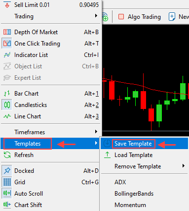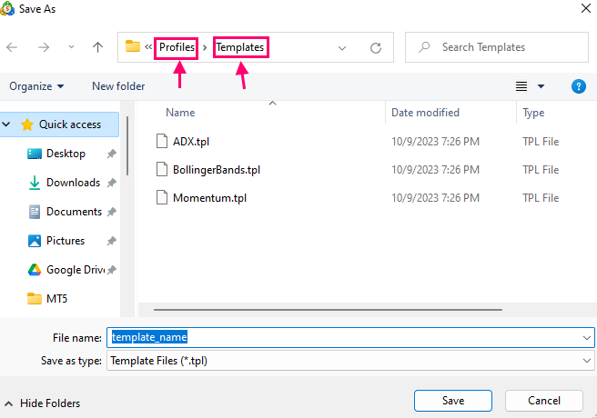 Simply right-click the chart, go to ‘Templates‘, and press ‘Save‘. It will open the MT5 directory.