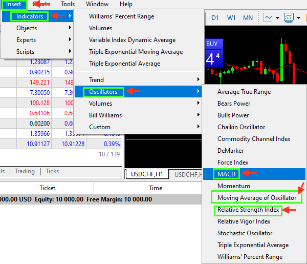 Navigate to the ‘Insert’ menu at the top, select ‘Indicators’, and choose from the vast list. Whether it’s Moving Averages, MACD, or RSI, MT5 offers a rich suite of indicators. Alternatively, use the Navigator pane for a drag-and-drop application on the charts.