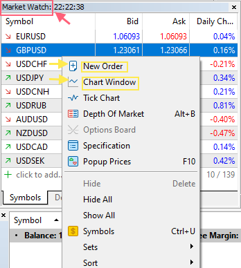 Located on the left side, this is where you’ll find a list of available instruments to trade, such as currency pairs, stocks, and commodities. A simple right-click provides options like ‘New Order’ or viewing the ‘Chart Window’.