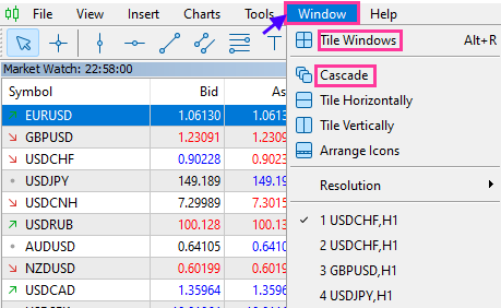 For traders monitoring multiple instruments, MT5 allows the arrangement of several chart windows. This can be achieved using the ‘Tile Windows’ or ‘Cascade’ options under the ‘Window’ menu.