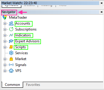 Below the Market Watch, the Navigator pane provides quick access to accounts, indicators, Expert Advisors, and scripts. It’s a one-stop shop for all MT5 tools and functionalities.