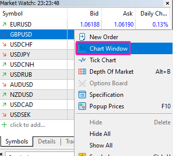 From the Market Watch, simply drag and drop an instrument onto the main workspace or right-click and select ‘Chart Window’.