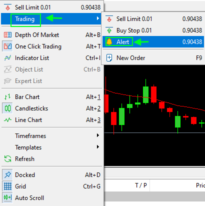 - Price Alert: Instead of constantly watching price movements, set a price alert. Right-click on the price chart, select ‘Trading,’ and then ‘Alert.’