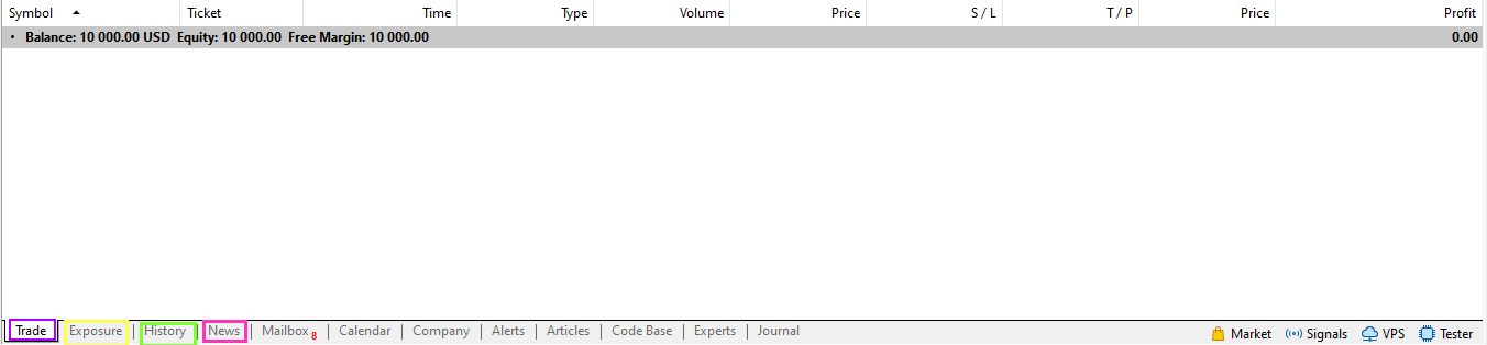 At the bottom, the Terminal consolidates several tabs: Trade (showing your current positions), Exposure, Account History, News, and others. This section is crucial for managing trades and staying updated.