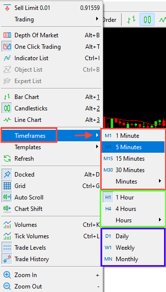 Above the chart, the toolbar contains icons for different timeframes, ranging from minutes to months. Click on your desired timeframe or right-click on the chart and hover over ‘Timeframes’ for a dropdown selection.