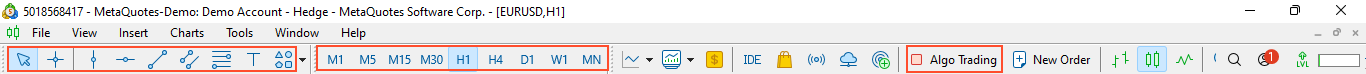 These are situated at the top, offering shortcuts for various functions like chart tools, timeframes, and algorithmic trading options.