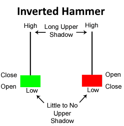 The formation of an inverted hammer involves an almost identical opening, closing, and low price. Furthermore, it features a long upper shadow, often twice as long as the real body of the candlestick.