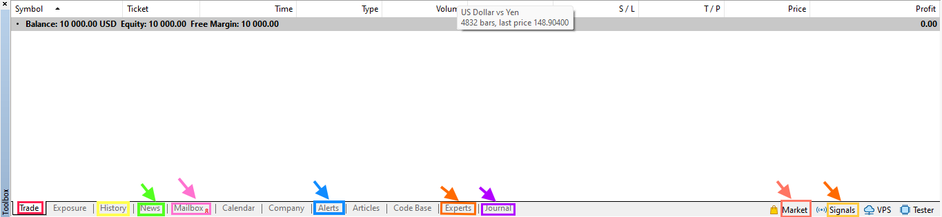 Here are the primary tabs and their elements within the Terminal window on MetaTrader 4: