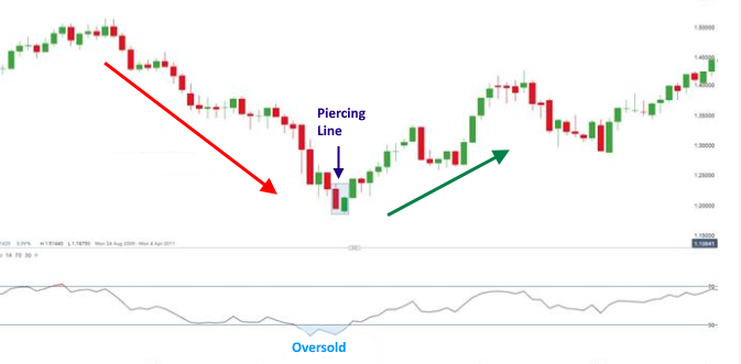The Piercing Line is a pattern that suggests a potential bullish reversal within the forex market. This piercing pattern should not be used in isolation but rather in conjunction with other supporting technical tools to confirm the piercing pattern.